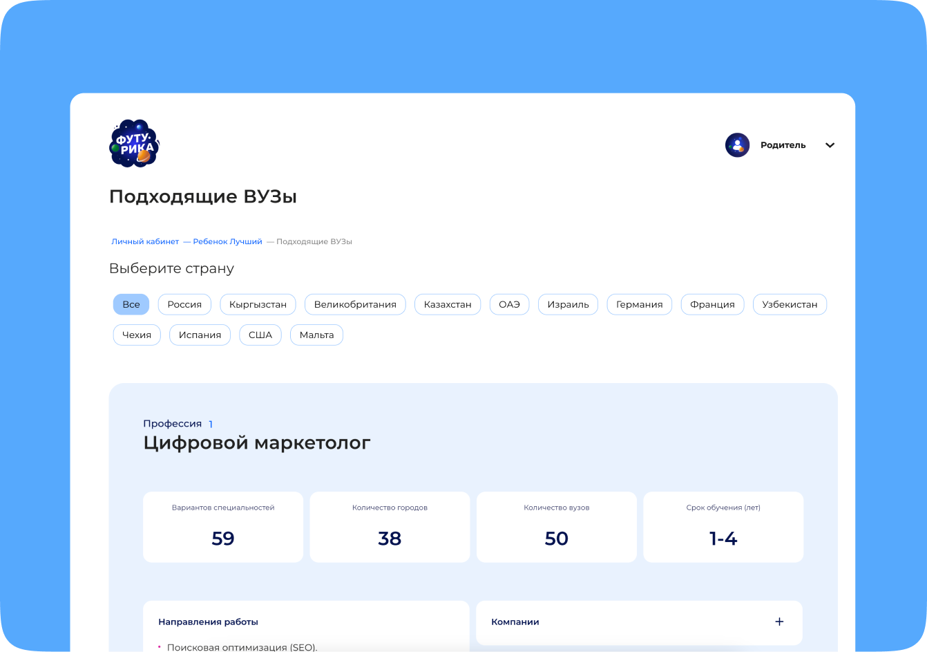 доходят до полного прохождения минимум одного блока профессий и просмотра релевантных ВУЗов, потенциальных работодателей и должностей
